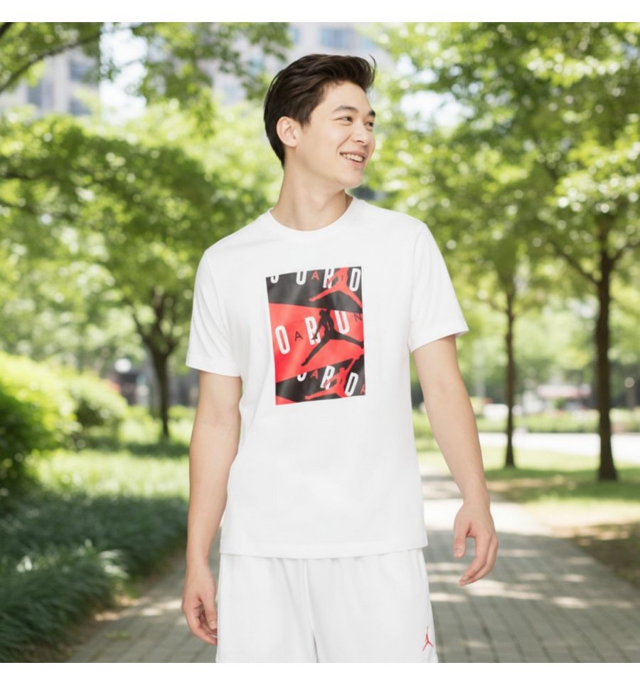 Белая Футболка Jordan Air Crew из 100% хлопка от бренда Jordan. Модель прямого кроя с круглым горловым вырезом дополнена крупным принтом брендинга.