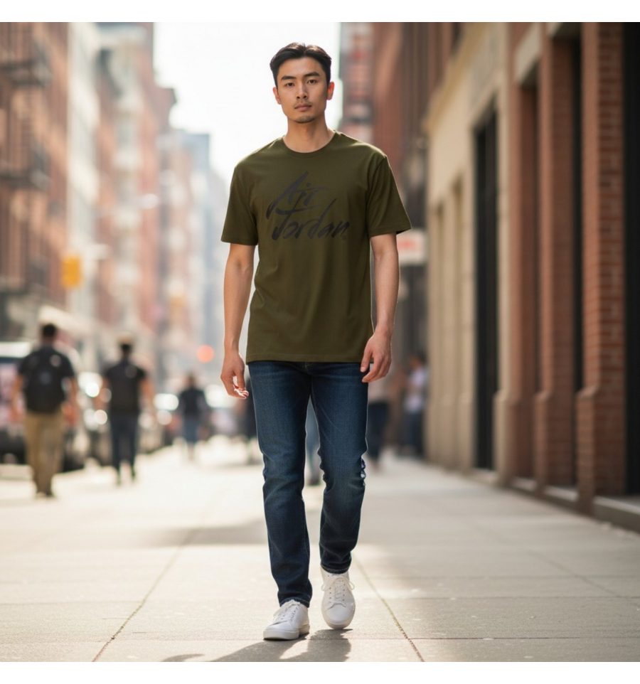 Зеленая Футболка Jordan JSW Greatest Air Jordan из 100% хлопка от бренда Jordan. Модель прямого кроя с круглым горловым вырезом дополнена крупным принтом брендинга.