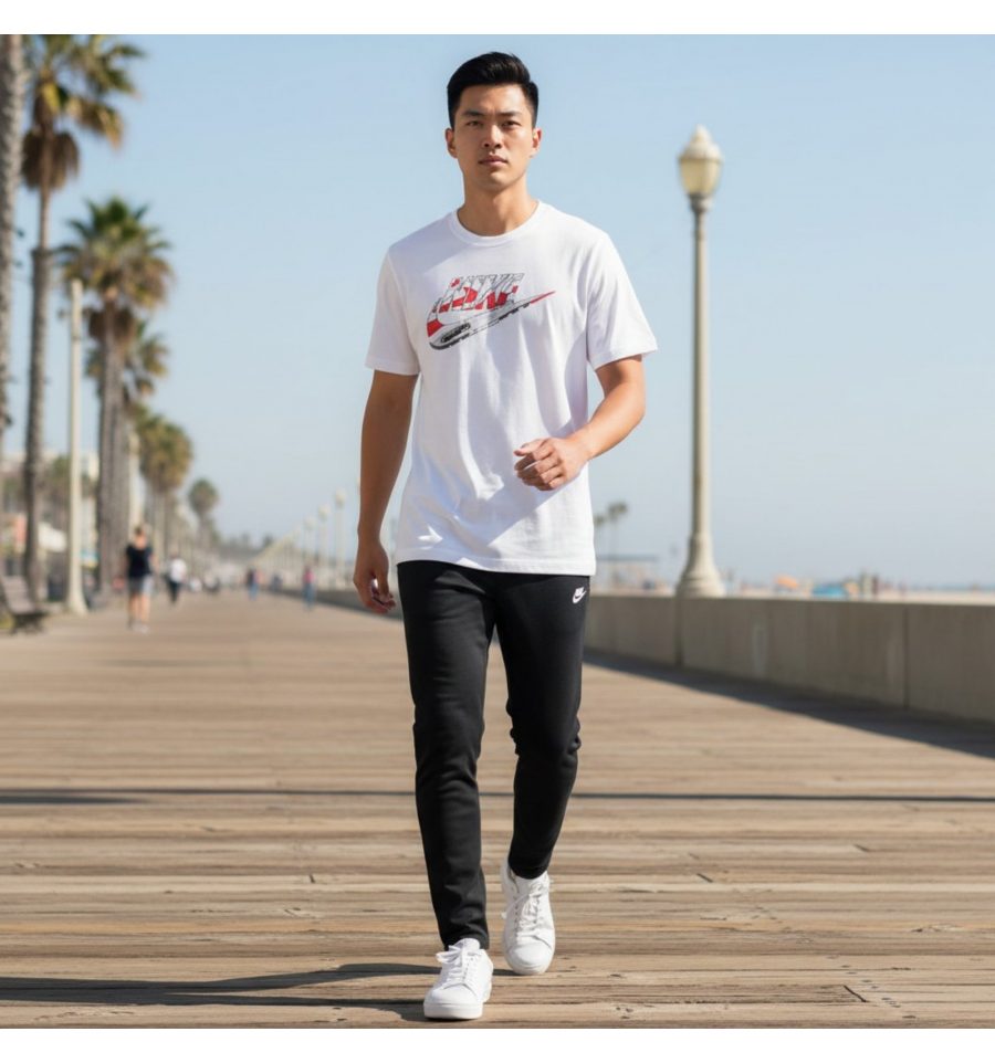 Белая Футболка Nike Seasonal Air Max из 100% хлопка от бренда Jordan. Модель прямого кроя с круглым горловым вырезом дополнена крупным принтом брендинга.
