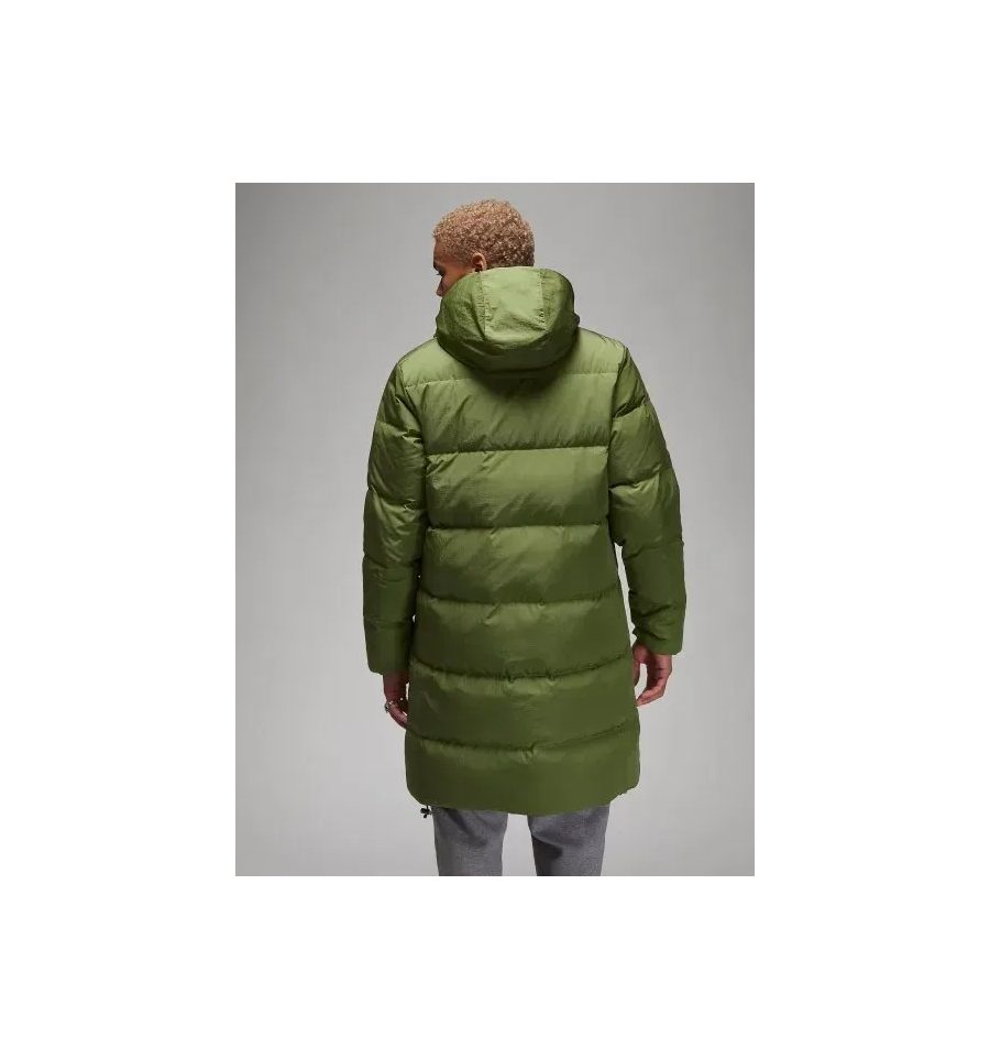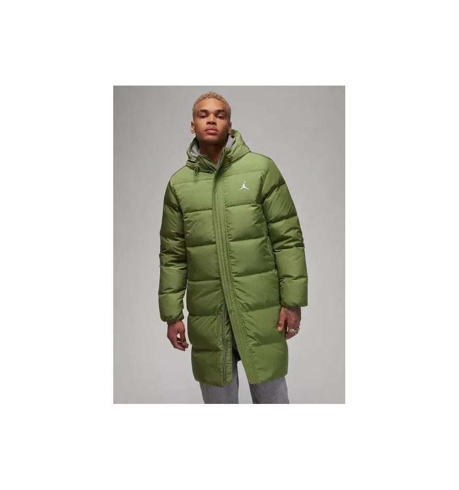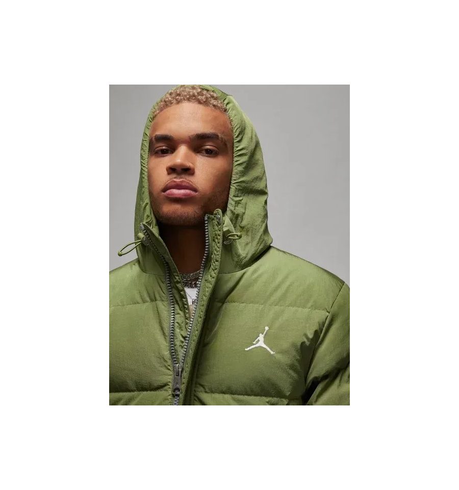 Склад Пуховика Jordan Essentials Olive - не менше 75% качиного пуху. Верхній шар виконаний з водовідштовхувального матеріалу, капюшон утеплений на шнурівці, кишені на блискавці і кнопках